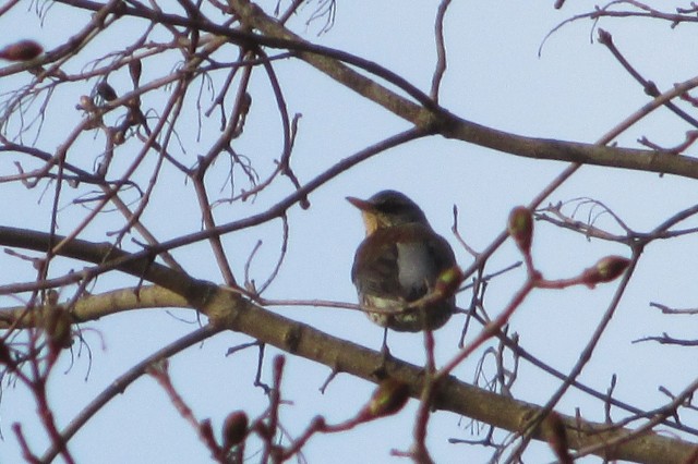 Jaa-jaa. Nyt heitti Anne vaikean, kun lintu on selin eikä väritys kunnolla erotu. Linnun nokan muodon perusteella lintu on kuitenkin hyönteissyöjä. Ensin pyörivät mielessäni harmaasieppo ja metsäkirvinen. Pikkuisen pönäkältä lintu kuitenkin vartaloltaan vaikutti, että kyseessä vosi olla vaikka punarinta, vaikka ei punaista rintaa selin näykään. Punarintanaaras on tosin tasaisen harmaa.
